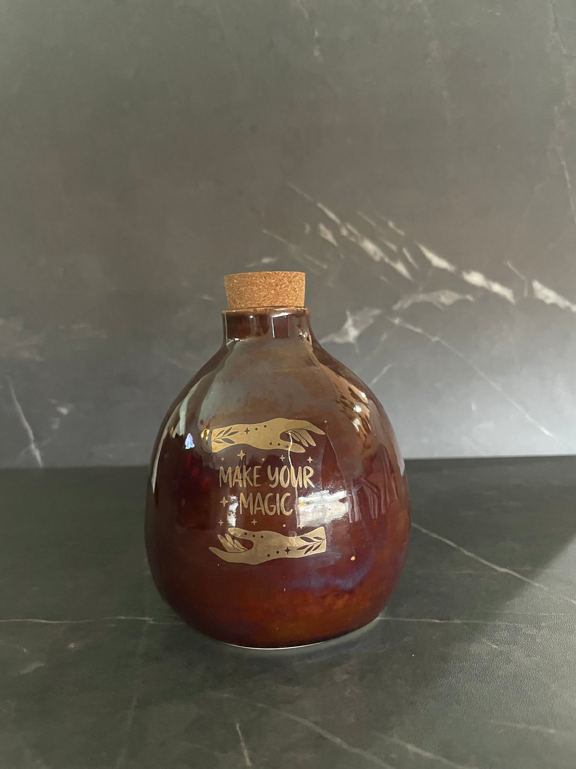 Glossy brown glaze that flashes purple and blue. A 24 karat gold design with whimsical hands saying Make Your Own Magic.